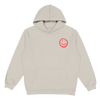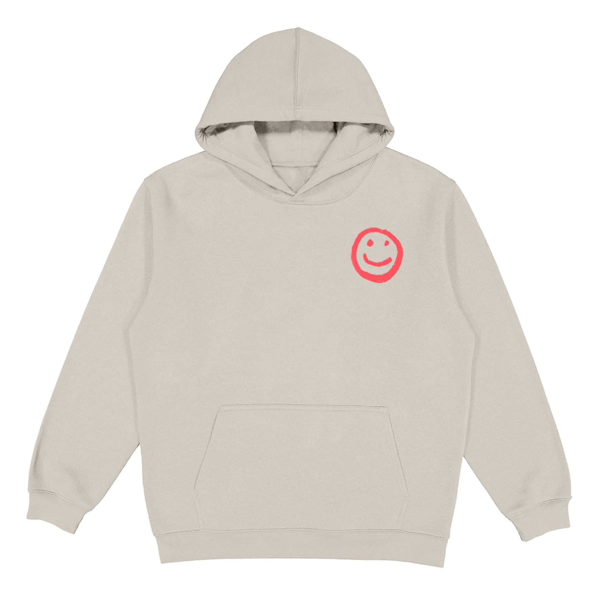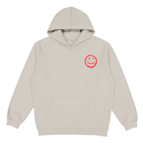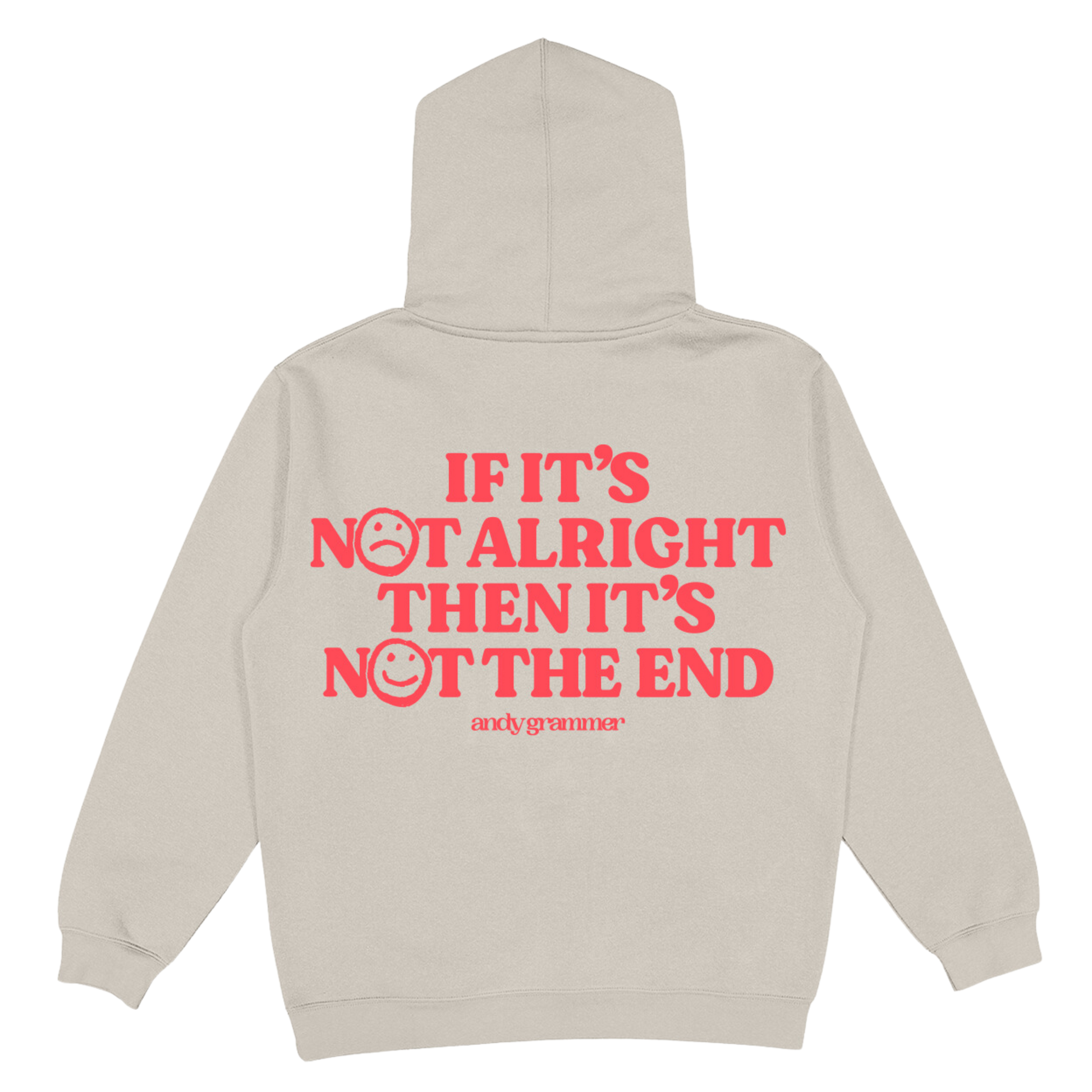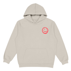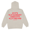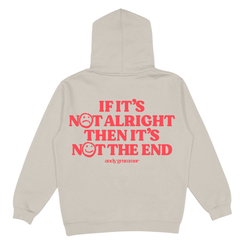 This tan hoodie features a red smiley face on the front and "if it's not alright then it's not the end" in red print on the back.